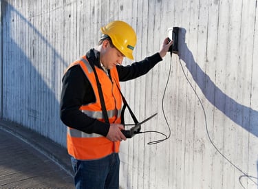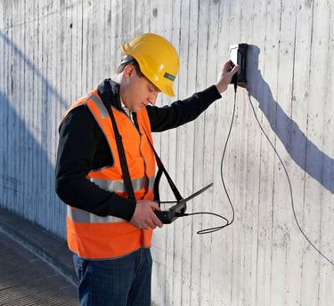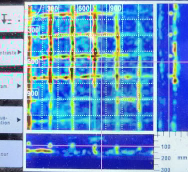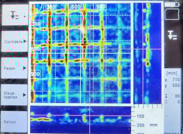 Essais non-destructifs : Auscultation par pachométrie (Ferroscan) afin de déterminer les caractéristiques d'une structure en béton armé (enrobage, armatures, épaisseur/section de l'élément), le positionnement des structures métalliques ou bois (solives, poteaux, poutres...)